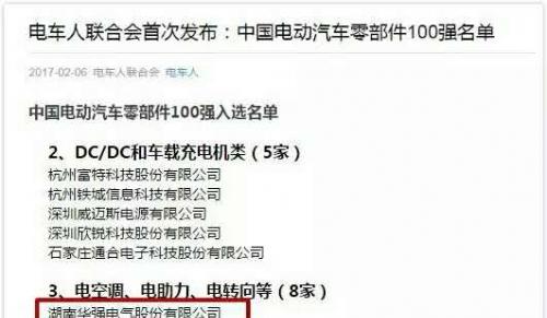 華強電氣成功進(jìn)入“2016年中國電動(dòng)汽車(chē)零部件100強”名單